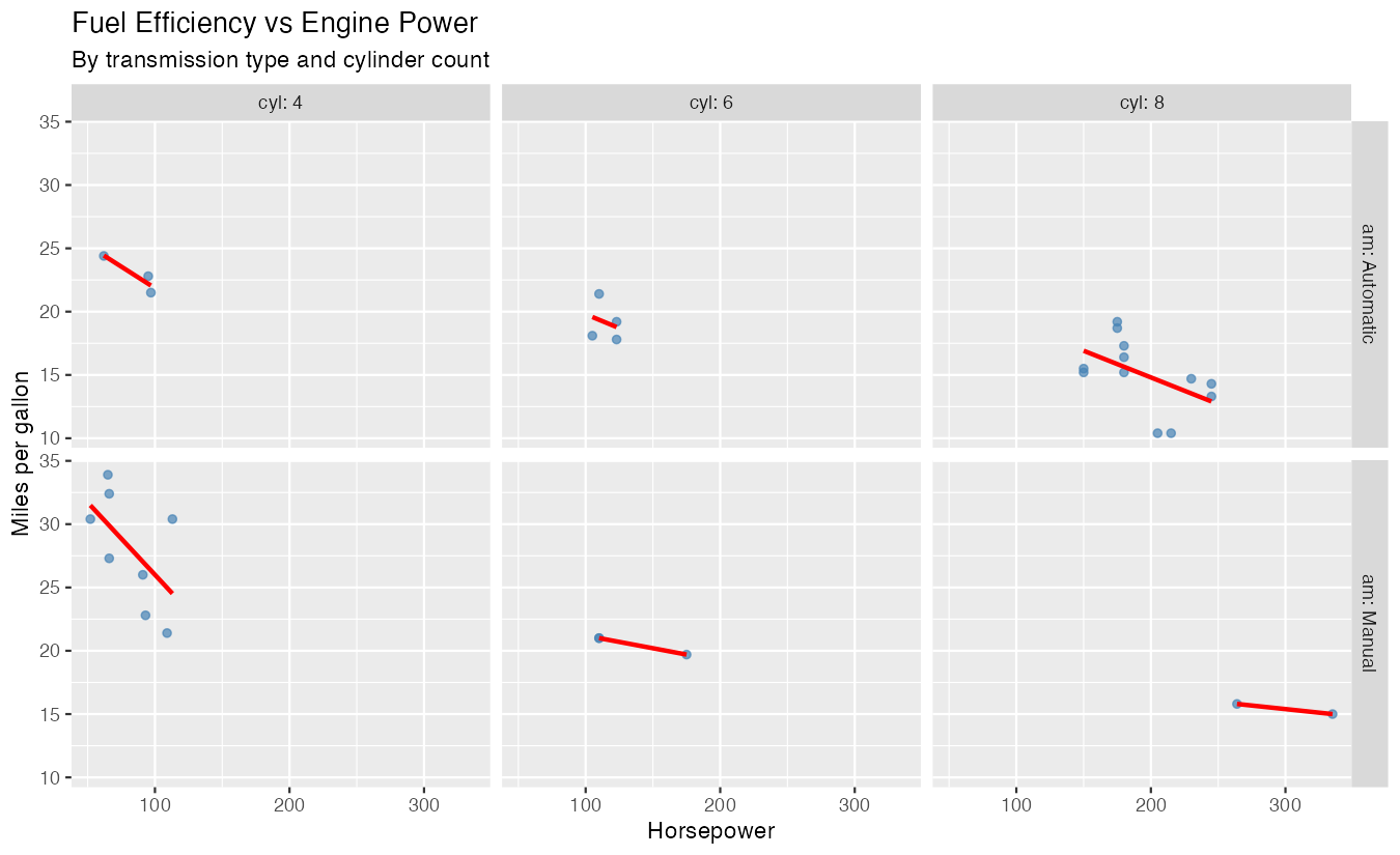 facet_grid(am ~ cyl)This creates a grid showing the horsepower-mpg relationship for each combination of transmission type and cylinder count, with trend lines for easy comparison.