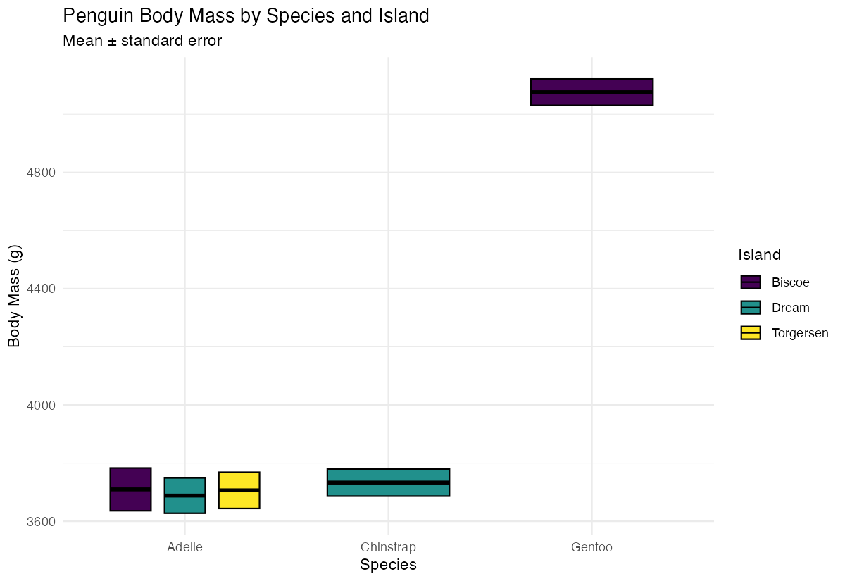 A researcher wants to compare body mass across penguin species and islands, showing both the mean and standard error for each group. This requires a more sophisticated statistical summary and grouping structure to provide meaningful insights for publication.