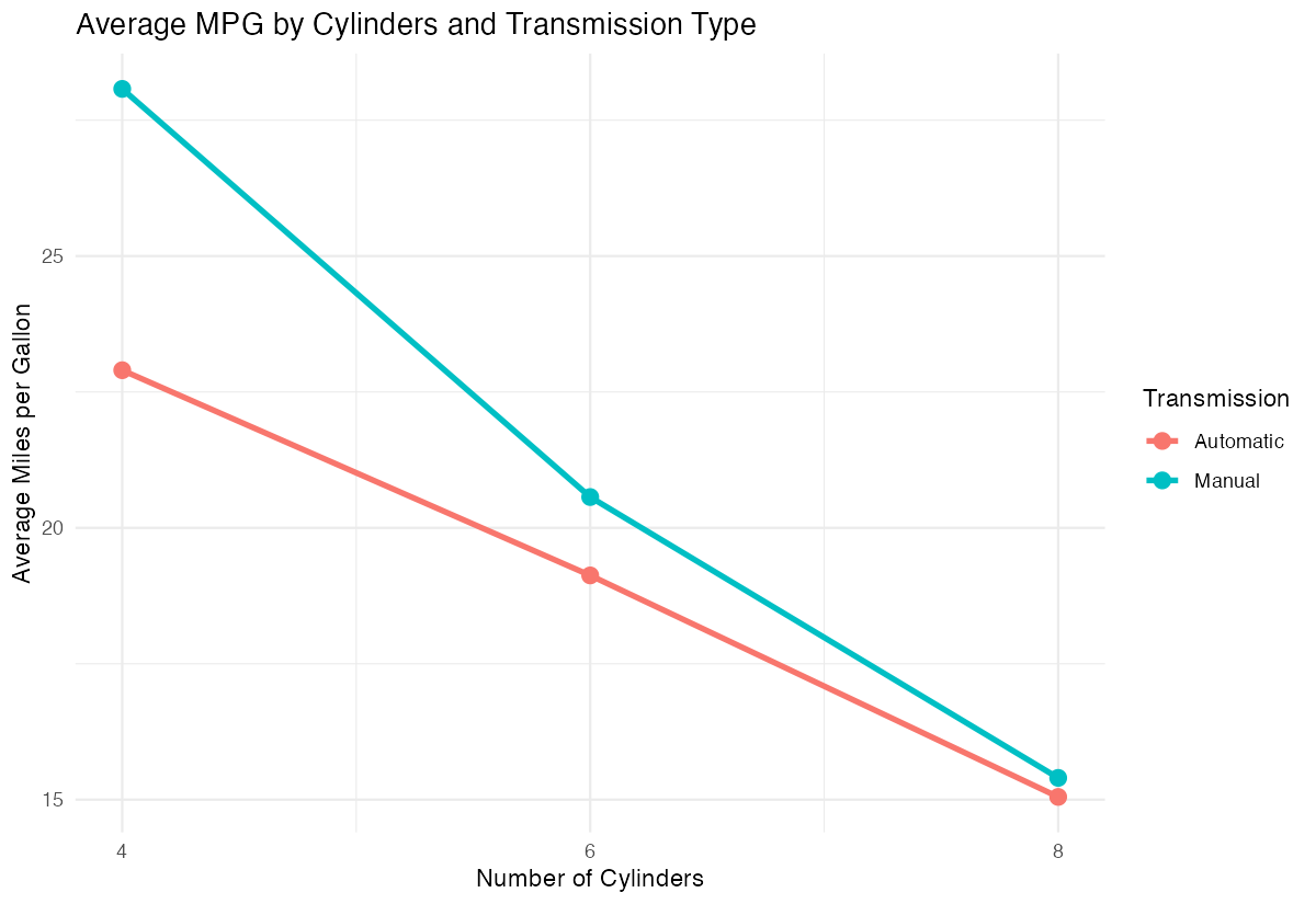 We want to analyze car performance trends over time using the mtcars dataset. Specifically, we’ll look at how average miles per gallon (mpg) varies across different numbers of cylinders, treating cylinders as a sequential variable to demonstrate time-series-like visualization.
