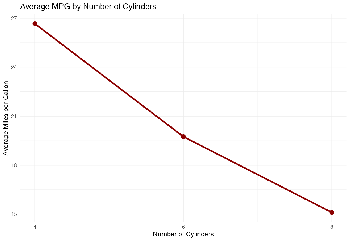 geom_point(size = 3, color = "darkred")The combination of line and points clearly shows the declining trend in fuel efficiency as cylinder count increases.