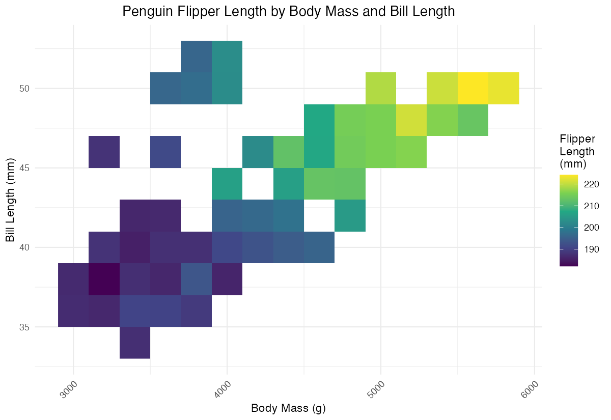 We want to create a simple heatmap showing the relationship between two variables using rectangular tiles. Let’s visualize how penguin bill length varies across different body mass ranges.