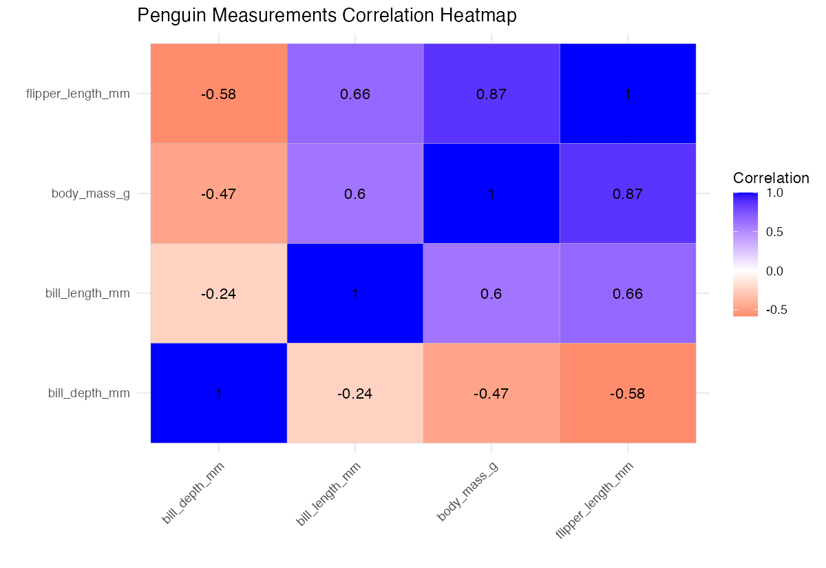 Correlation heatmap in R using geom_tile() and geom_text() in ggplot2 showing pairwise correlations between penguin bill, flipper, and body mass measurements