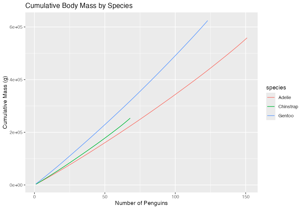 x = "Number of Penguins", y = "Cumulative Mass (g)")