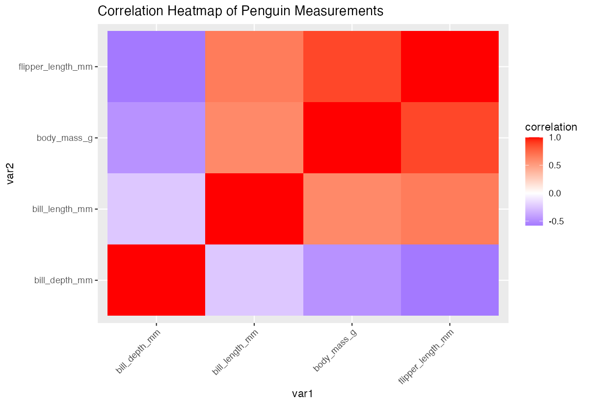 library(palmerpenguins)Example 1: Basic Correlation Matrix