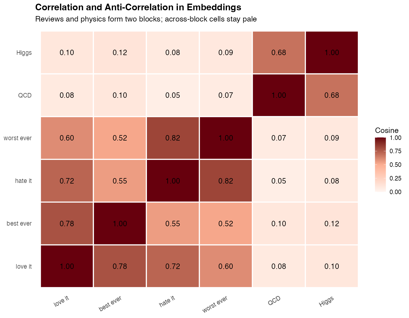 The standard way to compare embeddings is cosine similarity — the cosine of the angle between two vectors. Values range from -1 (opposite) to 1 (identical direction).