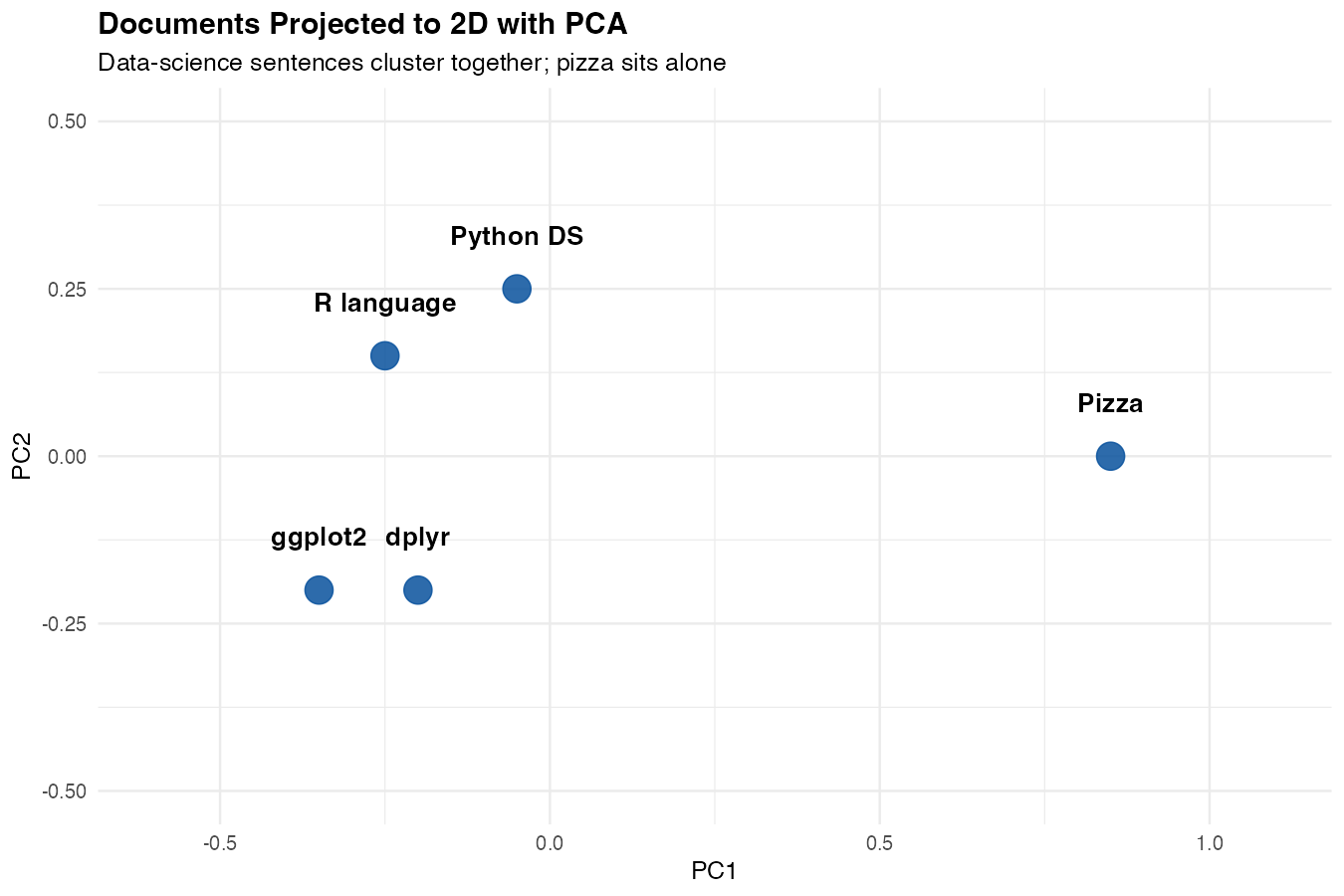For thousands of documents this is fine in pure R. For millions, you’ll want a vector database (pgvector, Qdrant, Pinecone).