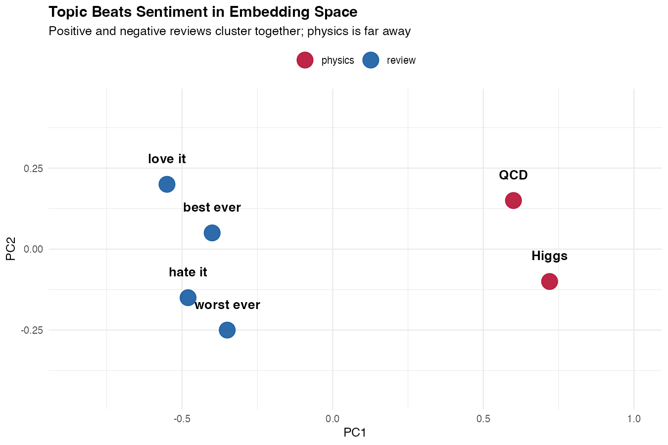 No — and this is a common pitfall. Embedding similarity captures topic, not agreement. Two sentences that say opposite things about the same subject often score high. For sentiment or stance detection, use an LLM with a classification prompt instead. See How to Analyze Sentiment with LLMs in R and How to Classify Text with LLMs in R.