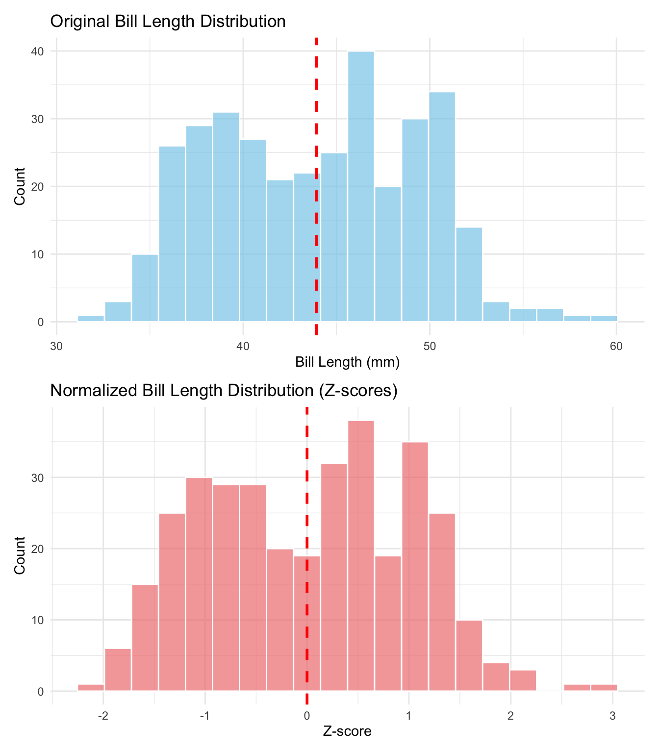 Interpretation: The z-scores tell us how many standard deviations each penguin’s bill length is from the average. For example, the first penguin has a bill length of 39.1mm, which is about 0.88 standard deviations below the average bill length across all penguins.