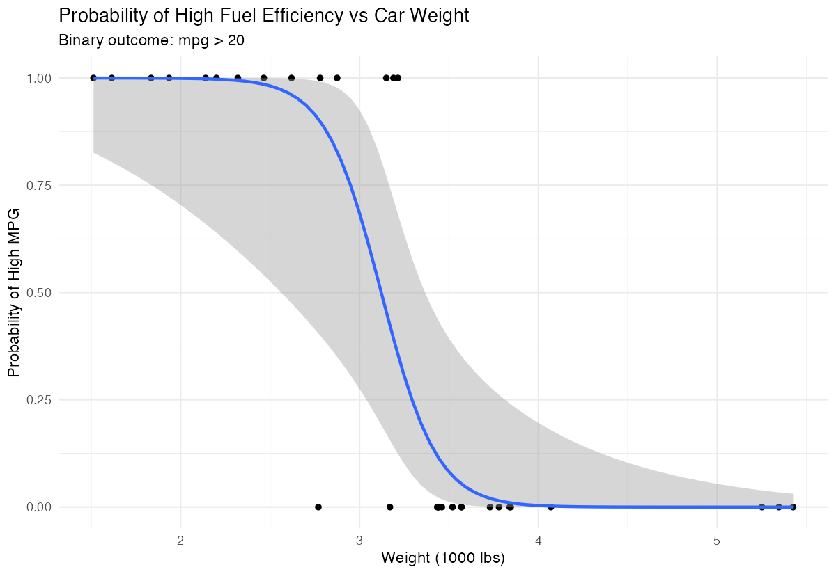 Single-predictor logistic regression curve in R showing probability of high fuel efficiency (mpg > 20) as a function of car weight from the mtcars dataset, fitted with glm() in ggplot2