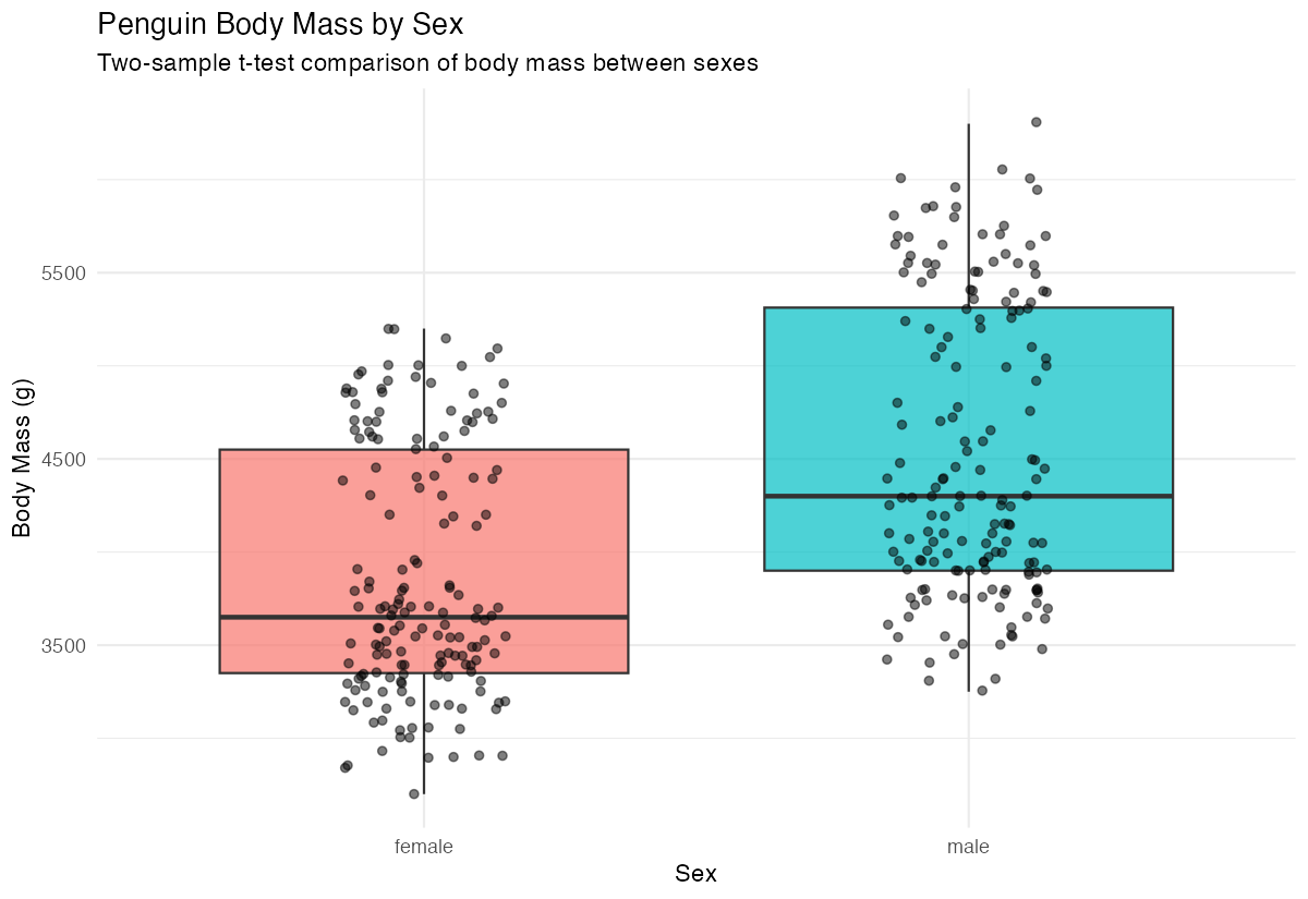 t.test(body_mass_g ~ sex, data = penguin_sex_data)This produces identical results but with more concise syntax using the formula notation.