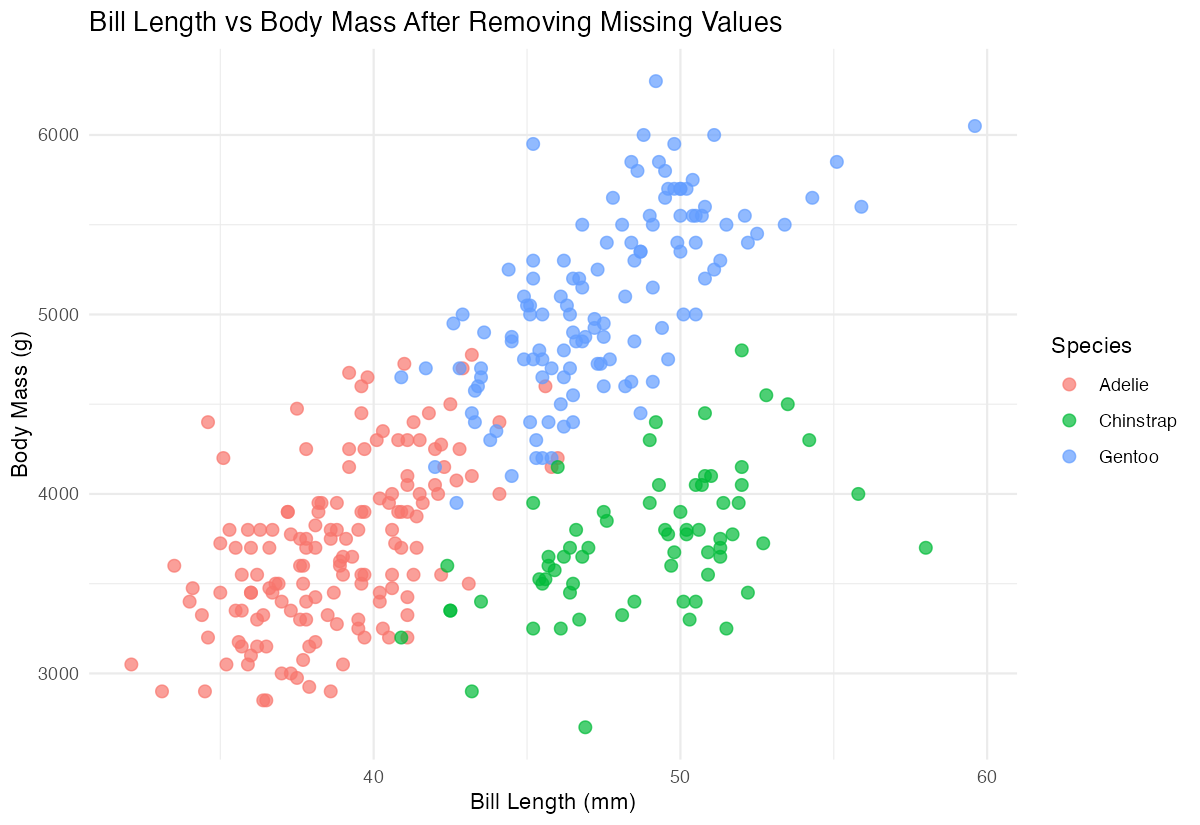 title = "Bill Length vs Body Mass After Removing Missing Values",